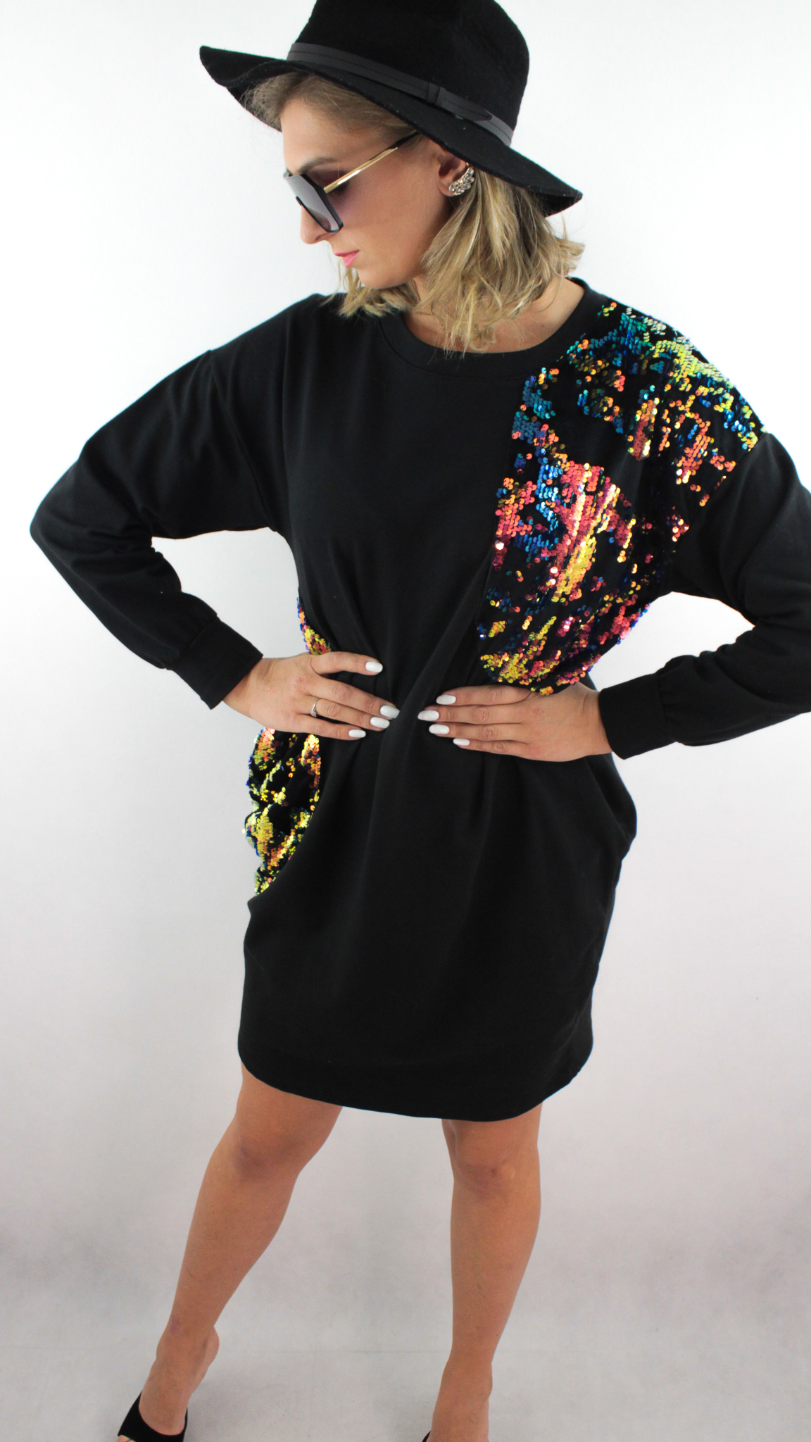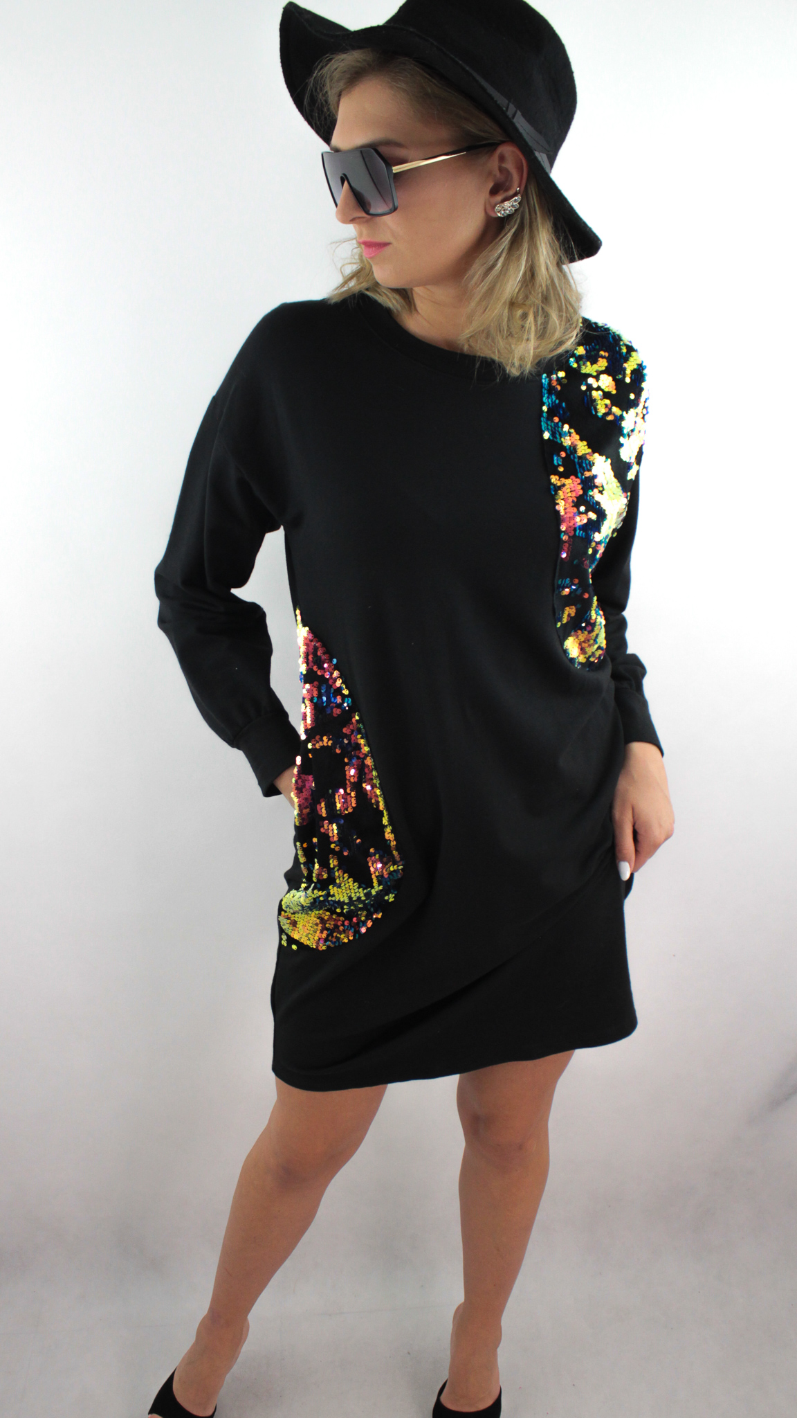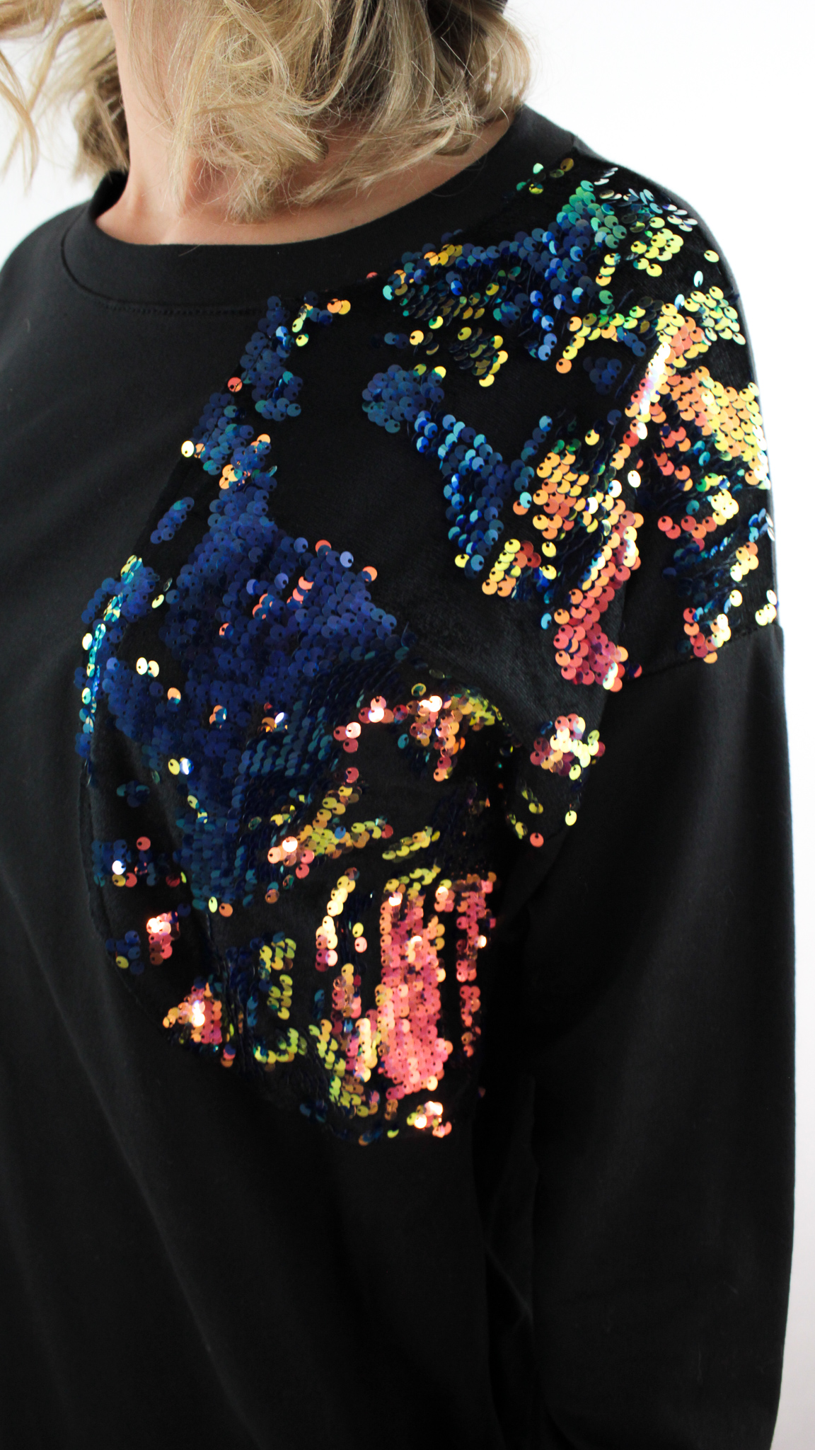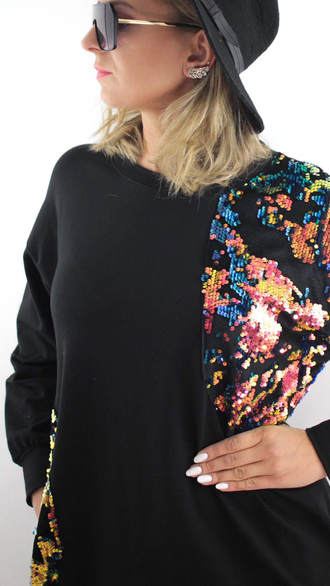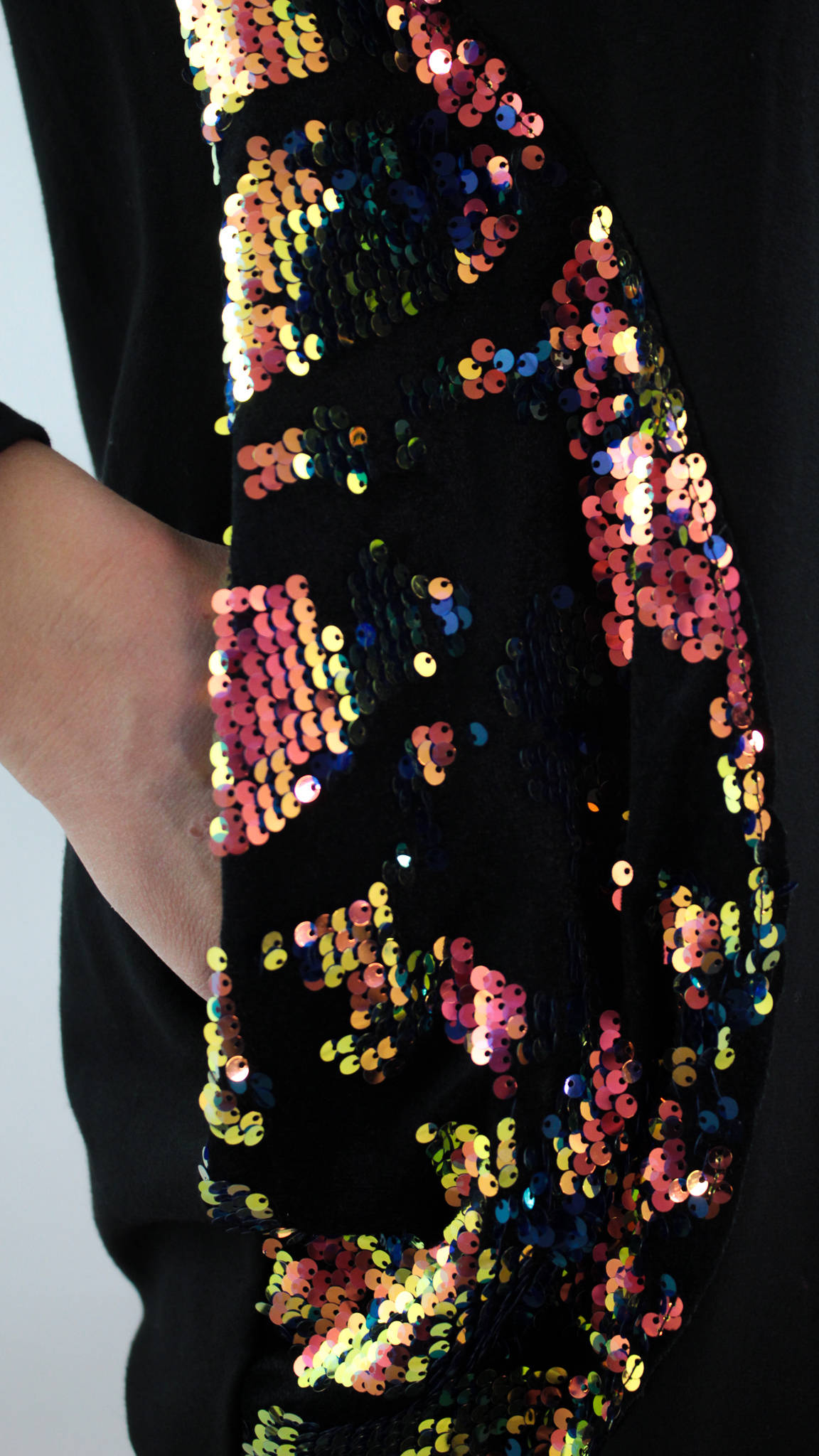 • Błyszczące, kolorowe cekiny umiejscowione na ramieniu oraz kieszeni